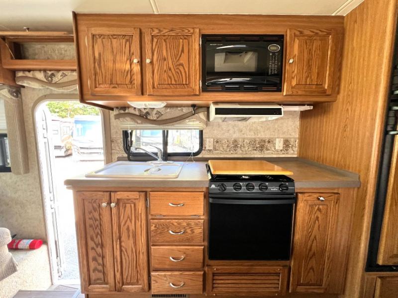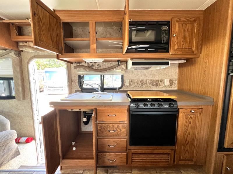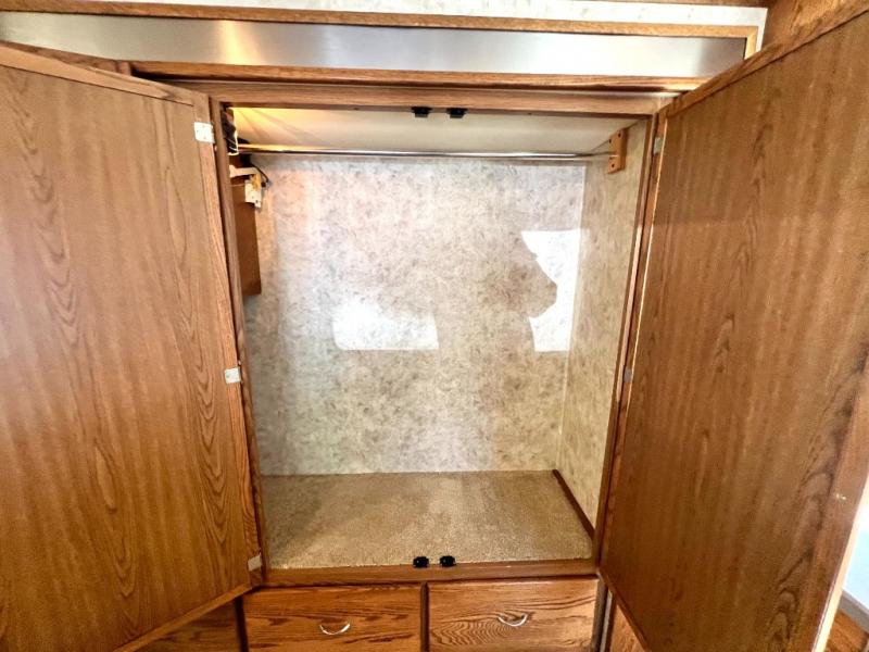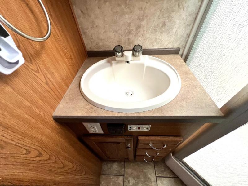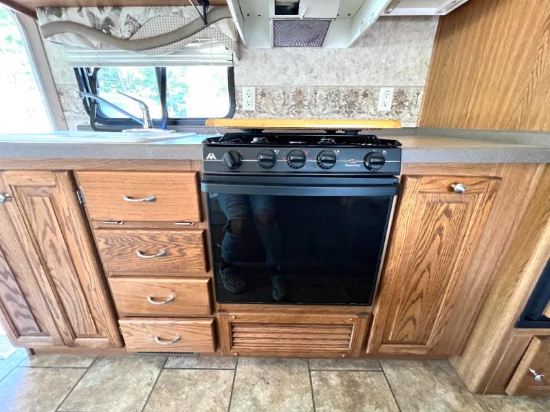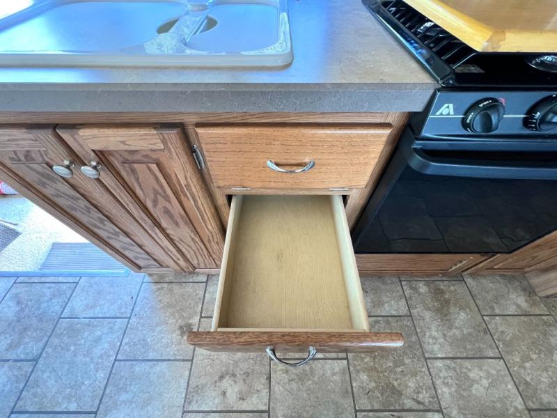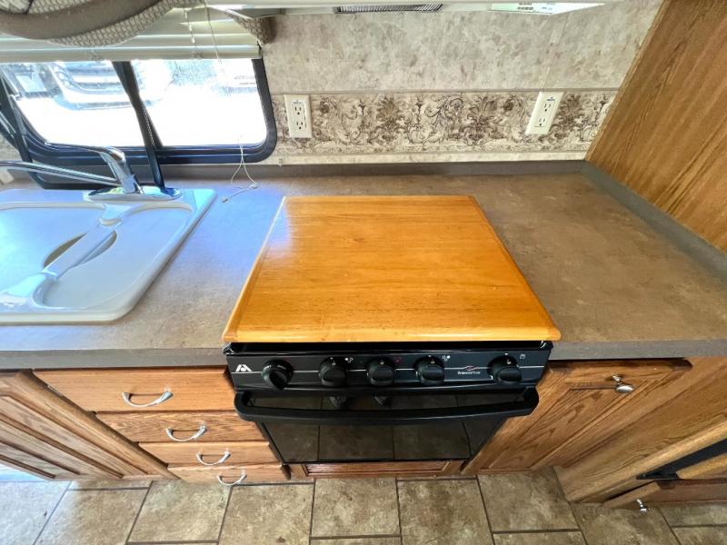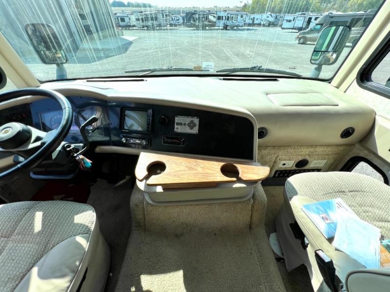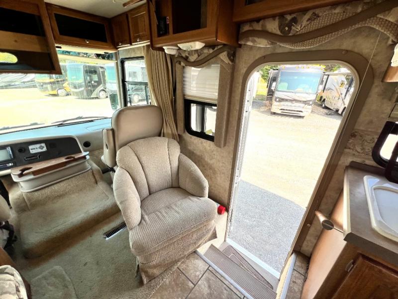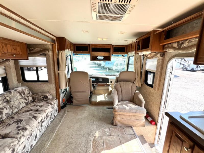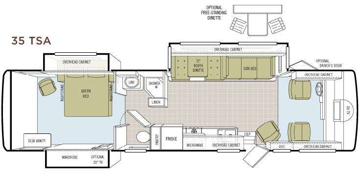 Triple Slide Class A Motorhome w/Rear Queen Bed w/Nightstands Slideout, Lounge Chair, Wardrobe w/Opt. 20" TV Slideout, Desk/Vanity, Private Toilet Area, Lav., Angle Shower, Linen Cabinet, Booth Dinette or Opt. Free Standing Dinette & Sofa Bed Slideout, Pantry, Refrigerator, Double Kitchen Sink, Lounge Chair, TV Above Cab Area, Overhead Cabinets Both Driver & Passenger Side, Opt. Driver Door and Much More. Ford Specs Shown. See us for Workhorse or Freightliner Diesel Choices.