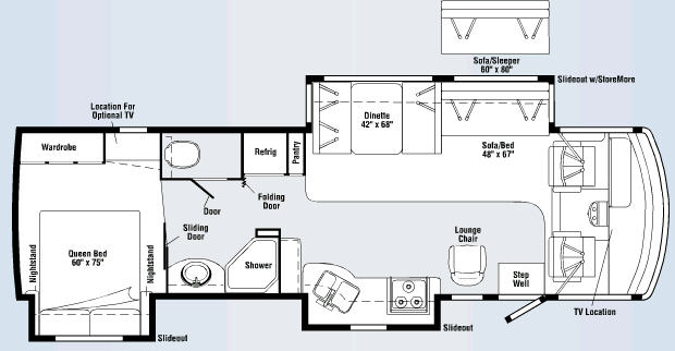 Triple Slide Class A w/Rear Queen Bed Slide, Nightstands, Wardrobe, Opt. TV, Stool Room, Vanity, Angle Shower, Sliding Door to Bedroom, Refrigerator, Pantry, Booth Dinette & Sofa Bed Slideout w/Exterior StoreMore. TV Above Cab Area, Lounge Chair, 3 Burner Range & Double Sink Slideout, Choice of Engine & Chassis and Much More. Ford Specifications Shown.