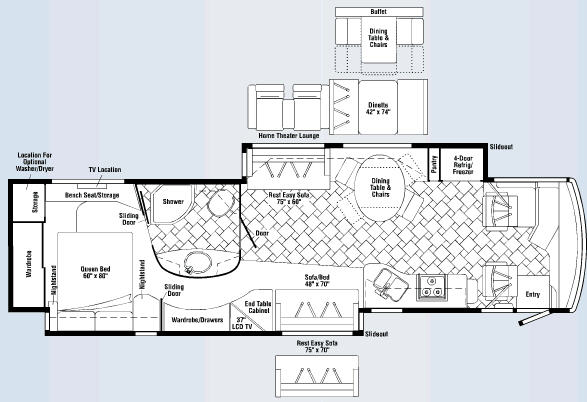 Double Slide, Rear Wardrobe w/Storage Cabinet or Opt. Wash/Dryer, Bench Seat w/Storage Below, Queen Bed w/Nightstands/Wardrobe w/Drawers/37" LCD TV/End Table Cabinet & Sofa Bed Slideout, Double Kitchen Sink, 3 Burner Range, 4 Door Refrigerator/Pantry/Oval Dinette & Chairs & Rest Easy Sofa Slideout, Opt. Booth Dinette and/or Home Theater Lounge IPO Dinette & Sofa, Angle Shower, Lav., Overhead Cabinets, Double Bath Entrance and Much More.