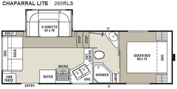 Chaparral Lite FW by Coachmen RV w/Single Slideout, Rear Sofa w/Shelf & End Table, Overhead Cabinet, U-Dinette Slide, Refrigerator, 3 Burner Range w/Microwave, Double Kitchen Sink, Ent. Center, Step Up to Bed & Bath w/Sink, Angle Shower, Toilet & Linen Cabinet, Front Queen Bed w/Wardrobes and More!