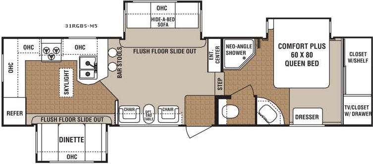 Dutchmen Denali Triple Slide, Rear Kitchen w/Slideout Dinette, Double Kitchen Sink, 3 Burner Range, Refrigerator, Skylight & Breakfast Bar w/Bar Stools, Slideout Sofa Hide-A-Bed, 2 Lounge Chairs w/End Table Opt., Ent. Center, Step Up to Bed & Bath w/Angle Shower, Private Toilet Area, Dresser, Queen Bed Slide w/Comfort Plus, Closet w/Shelves, TV Closet w/Drawers and More.