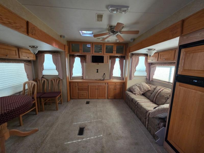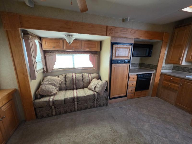 AMAZING QUALITY AND CONDITION!!Triple Slide Fifth Wheel w/Rear Living Area Including Full Wall Entertainment Center, Slide Out Lounge Chair & Round Dining Table w/Chairs, Slide Out Magic Store Sofa/Refrigerator/3 Burner Range & Lawn Chair Storage, L-Countertop w/Drop End, Corner Double Sink, Overhead Cabinets, Pantry, Step Up to Side Aisle Bath w/Shower, Washer/Dryer or Closet, Toilet & Sink, Front Queen Bed Slide Out w/Nightstands, Linen Cabinet, Side Vanity, TV/Drawers, Full Closet w/Mirrored Drawers and More!