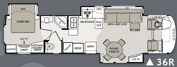 Triple Slide Class A, Rear Queen Bed Slideout w/Nightstands, Wardrobe/Vanity w/TV Above, Opt. Wash/Dryer, Lav., Angle Shower, Private Toilet Area, Pantry, Refrigerator, Round Dinette w/Chairs & 32" LCD TV Slideout, Hide-A-Bed Sofa w/One Side Recliner, Pull Out Counter & 3 Burner Range w/Microwave Slideout, Double Kitchen Sink and Much More.
