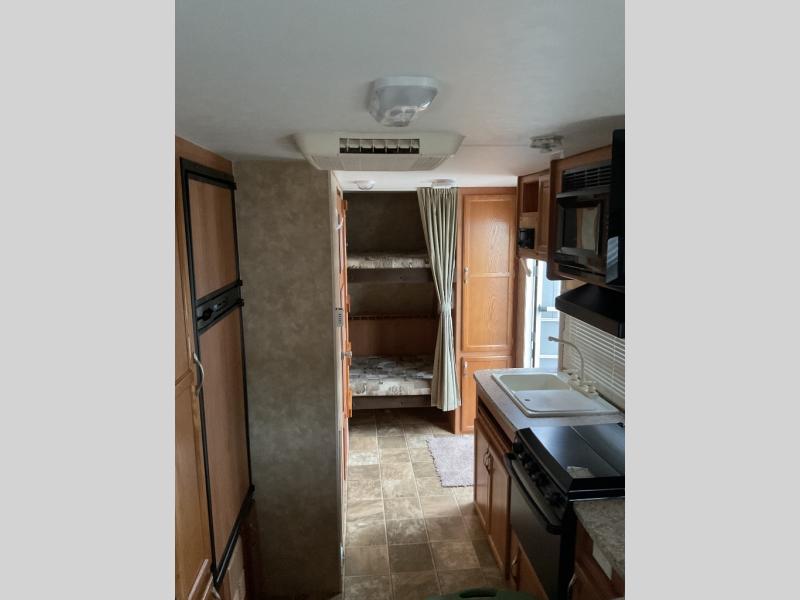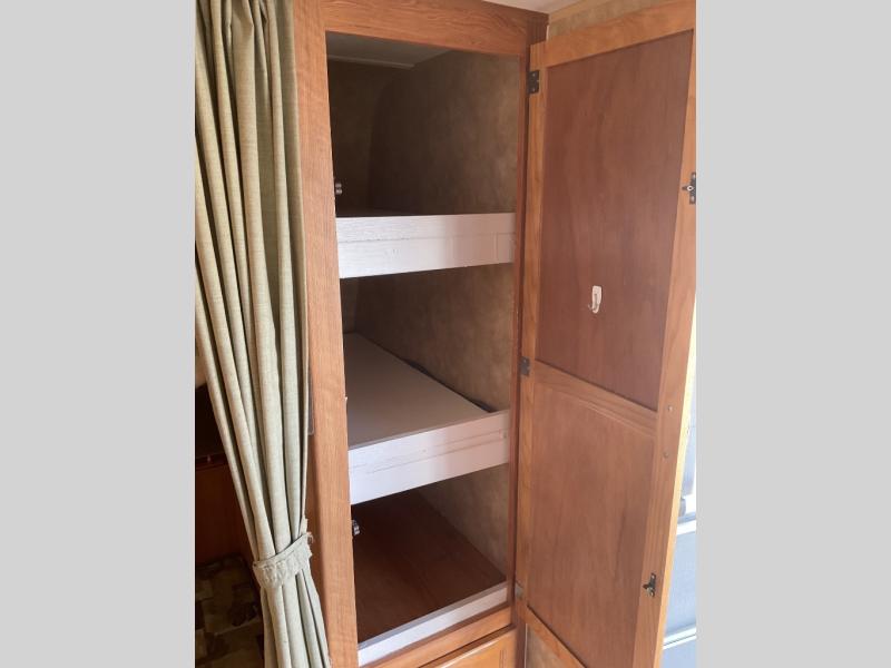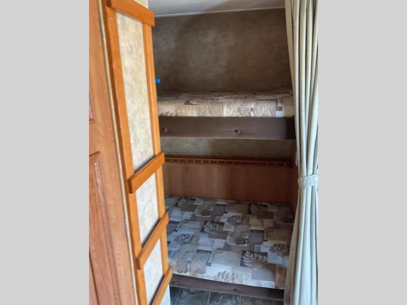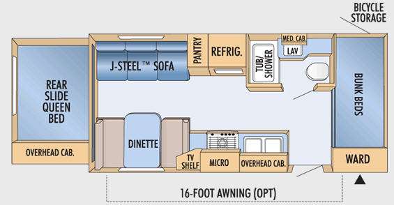 Jay Feather EXP by Jayco, Rear Single Slide Expandable, Rear Slide Queen Bed w/Overhead Cab., J-Steel Sofa, Booth Dinette, TV Shelf, Microwave, 3 Burner Range, Overhead Cabinet, Pantry, Refrig., Tub/Shower, Toilet, Front Bunk Beds w/Wardrobe, Bicycle Storage, Opt. 16 ft. Awning and More.