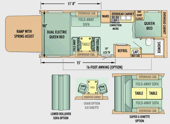 Octane ZX Toy Hauler Travel Trailer, Rear Ramp w/Spring Assist, 11'8" Up to 15' Cargo Space, Electric Dual Pull Down Queen Bed or Opt. Lower Rollover Sofa, Fold-A-Way Sofa, Fold-A-Way Dinette or Opt. Chair ILO Dinette or Super U-Dinette Opt., Ward., 19" LCD TV, 3 Burner Range w/Conv. Micro., Dbl. Kit. Sink, Refrig., Front Bath, Lav. w/ Med. Cabinet, Shower, Front Queen Bed w/Overhead Cabinet & Shirt Closet, 16' Opt. Awning and More.