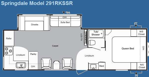 Springdale SSR Travel Trailer by Keystone RV w/Rear Kitchen Including Refrigerator, 3 Burner Range, Sink, Linoleum Flooring, Counter Space & Overhead Cabinets, Pantry & Super Size U-Dinette & Sofa Bed Slideout, 2 Lounge Chairs, LCD TV, Carpet in Living Area, Linoleum in Bed & Bath w/Private Toilet & Tub/Shower Area, Separate Bath Sink, Wardrobe, Queen Bed w/Nightstand/Closets, Pass-Thru Storage & More!