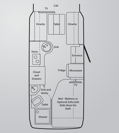 General Specifications Chassis: Mercedes-Benz Sprinter 3500 Cutaway Body: Full fiberglass widebody construction Length: Approximately 24' 4" Engine & Performance Engine: Mercedes-Benz 3.0L V6 Turbo Diesel Horsepower: 154 hp @ 3400 rpm Torque: 280 lb-ft @ 1200-2400 rpm Transmission: 5-speed automatic with Autostick Brakes: 4-wheel disc with ABS Towing Capacity: 5,000 lbs Tank Capacities Fresh Water: 47 US Gallons Grey Water: 39 US Gallons Black Water: 29 US Gallons Propane Tank: 57 lbs Appliances & Features Refrigerator: 6.4 cubic foot (gas/electric/110V) Water Heater: 6-gallon propane/110V Generator: 3.6KW propane generator Furnace: 16,000 BTU ducted Air Conditioner: 13,000 BTU ducted Awning: 11' 6" Interior Features Countertop: Solid surface Stove: Two-burner glass top Bathroom: Private rear bath with separate shower, toilet, sink, and vanity Bed: Stationary mattress with storage Fan: Fantastic Fan with rain sensor
