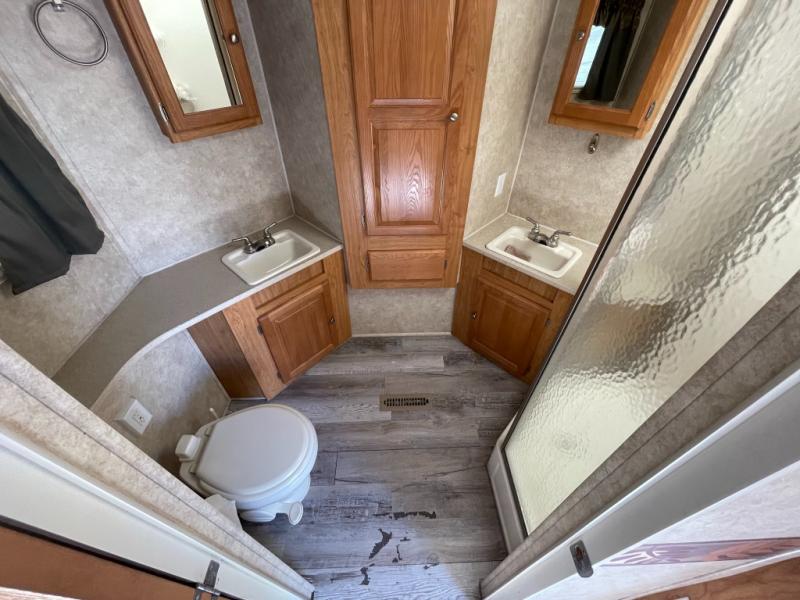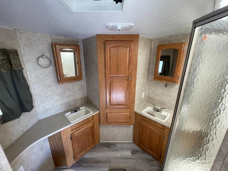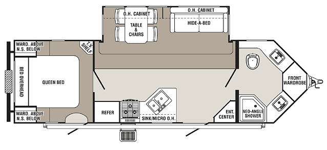 V-Series Travel Trailer w/Rear Queen Bed w/Wardrobes Above Nighstands Both Sides of Bed, Private Bedroom Entry, TV Shelf, Dining Table & Chairs & Hide-A-Bed Sofa Slideout Both w/Overhead Cabinets, Refrigerator, 3 Burner Range, Dbl. Kitchen Sink, Ent. Center, Front Bath w/Angle Shower, Toilet, Vanity w/Sink, Front Wardrobe, 2nd Vanity w/Sink and More!