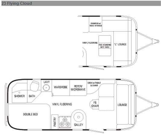 Airstream Flying Cloud Trailer w/Rear Corner Dry Bath & Toilet, Separate Lav., Wardrobe, Microwave, Refrigerator, Rear Corner Double Bed, Pantry, 3 Burner Range, Kitchen Sink, Front Sofa w/Hamper, Fold Out Table w/FS Chair, or Optional L Sofa w/Free Standing Gate Table & Drawers/Table Stow, Desk w/Table & Chair and More.