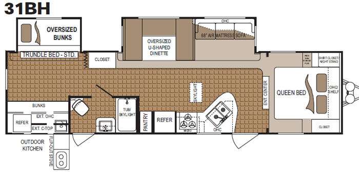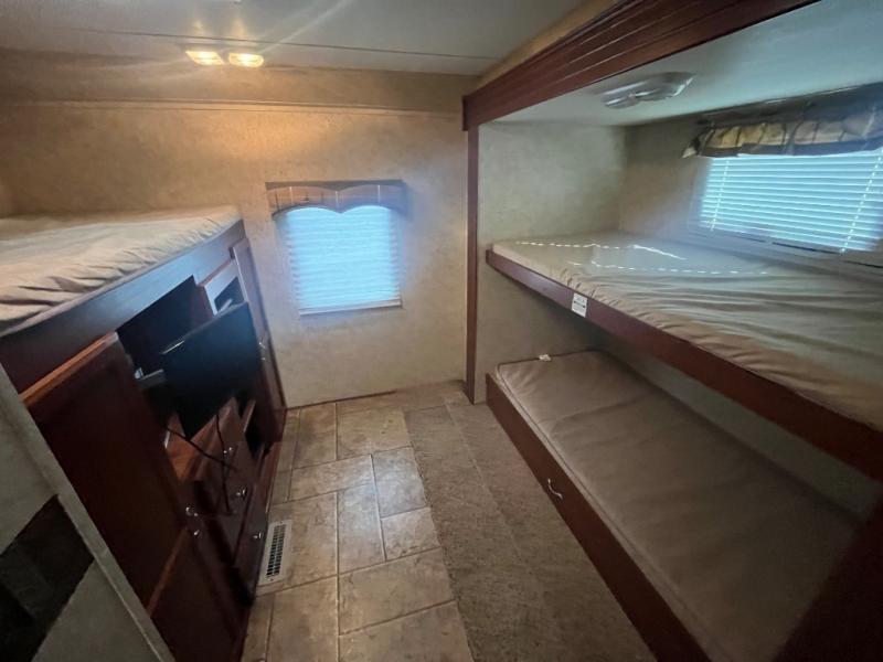 Colorado Bunkhouse Travel Trailer w/Rear Oversized Bunk Slideout w/Trundle Below, Closet, 3rd Bunk w/Exterior Patio Kitchen w/Refrig., Countertop & Flip-Out Stove, Bath w/Exterior Entry, Tub/Shower w/Skylight, Toilet & Sink, Pantry, Refrigerator, 3 Burner Range, Dbl. Kitchen Sink, Oversized U-Shaped Dinette & 68" Air Mattress Sofa Slide, Skylight, Ent. Center, Front Queen Bed w/Shirt Closet/Nightstand, 2nd Closet, Pass-Thru Storage, Overhead Cabinet & Shelf Above Bed and Much More!