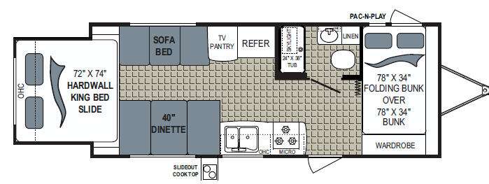 Kodiak Travel Trailer w/Rear Hardwall Slideout King Bed w/Overhead Storage, Sofa Bed, Booth Dinette, TV/Pantry, Refrigerator, Bath w/Angle Shower, Linen Cabinet, Vanity w/Sink & Toilet, Dbl. Kitchen Sink, 3 Burner Range, Front Bunk Beds 34" x 78" w/Wardrobe, Pac-N-Play, Slideout Cooktop & More!