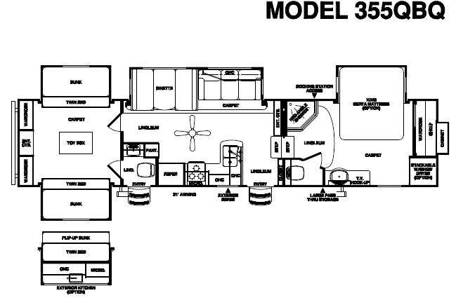 Quad Slide Sierra Bunkhouse Fifth Wheel, Rear Quad Bunk Slide Outs w/Trundle Mattress Below, Wardrobe/Ent. Center/Wardrobe, Booth Dinette & Sofa Slide Out, Double Kitchen Sink, 3 Burner Range, Refrigerator, Pantry/Closet, Ceiling Fan, Ent. Center, Step Up to Private Toilet Area, Corner Shower, Lav., Pass-Thru Storage, Dresser, Queen Bed Slide Out or Opt. King Bed, TV/Wardrobe, Large Wardrobe w/Sliding Doors & Shelf Both Sides, 21' Awning & More!