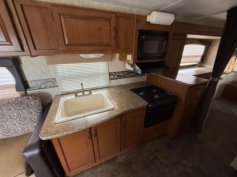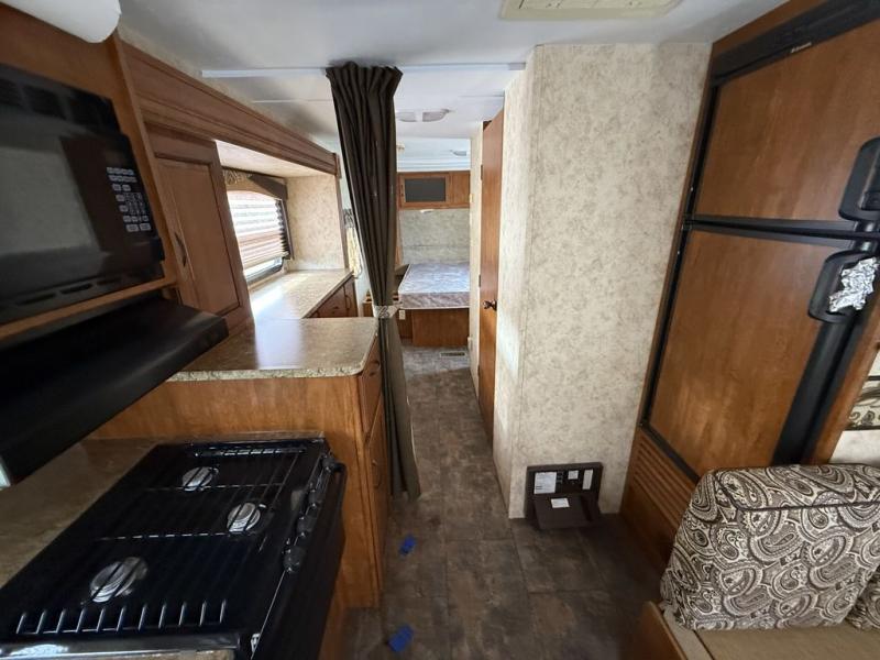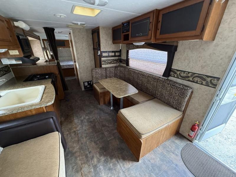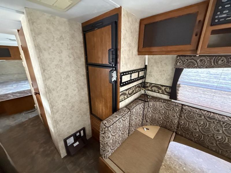 Keystone Bullet Travel Trailer w/Rear Living Area Including 2 Chairs, End Table w/Overhead Storage, Sofa/Double Kitchen Sink/3 Burner Range/Pantry & Dresser w/Drawers Slideout, U-Shaped Dinette w/Overhead Storage & Swing-Out LCD TV, Refrigerator, Angle Shower, Linen Cabinet, Sink & Toilet, Front Queen Bed w/Wardrobes, Laundry Chute, Front Pass-Thru Storage, Private Bedroom Entry and More!