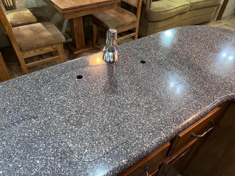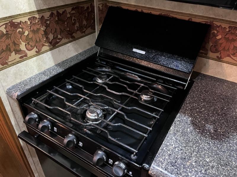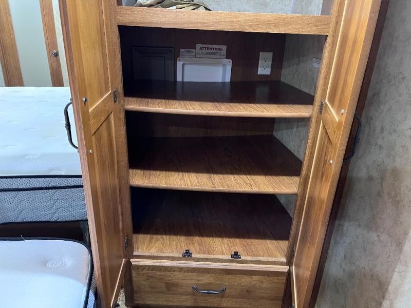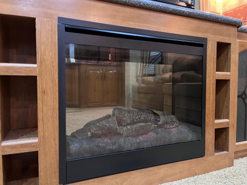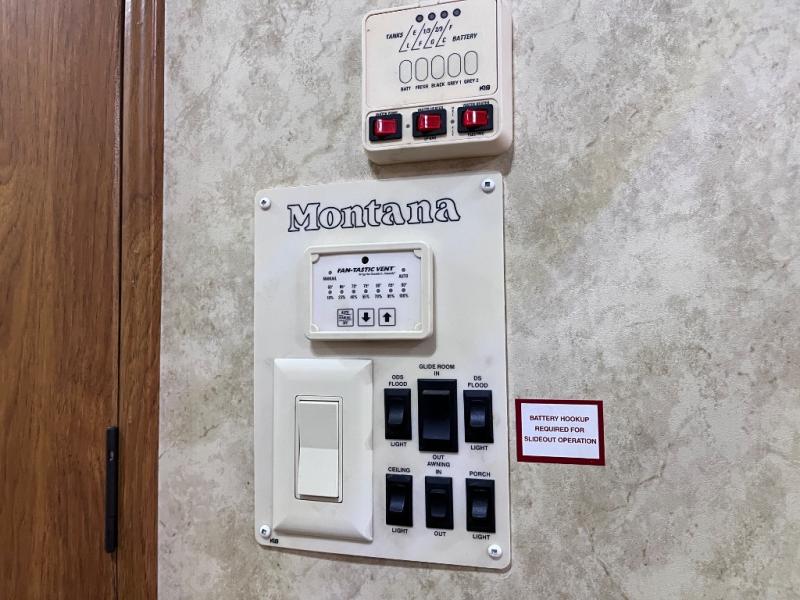 Quad Slide Montana Fifth Wheel, Rear Fireplace & 42" Lift-Up TV, Two Lounge Chair Slideout, Sofa Air Mattress Hide-A-Bed & Free Standing Dinette w/Chairs Slideout, 3 Burner Range/Pantry/Refrig. Slideout, L-Shaped Counter w/Dbl. Kitchen Sink, Overhead Cabinets, Pantry, Step Up to Side Aisle Bath w/Garden Tub, Toilet, Lav. w/Med. Cab., Front Queen Bed Slide w/Nightstands, Opt. King Bed, 6-Drawer Chest, Washer/Dryer Prep., Wardrobe w/Sliding Doors and More.