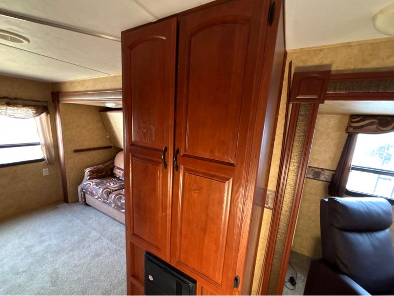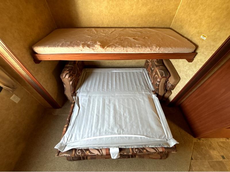 Double Slideout Bunkhouse Sydney Trailer w/Rear Bunk Bed Slide w/Trundle Below or Opt. Air Sofa Sleeper, Bunk Above Wardrobes, Outside Storage Below Bunk, Tub/Shower, Toilet, Sink, Private Bath Entry, Pantry, King Dinette & Air Sofa Sleeper Slide, Overhead Cabinets Throughout, 2nd Pantry, Refrigerator, 3 Burner Range, Double Kitchen Sink, Swivel LCD TV, Front Queen Bed w/Wardrobes Both Sides, Pass-Thru Storage in Front and Much More!
