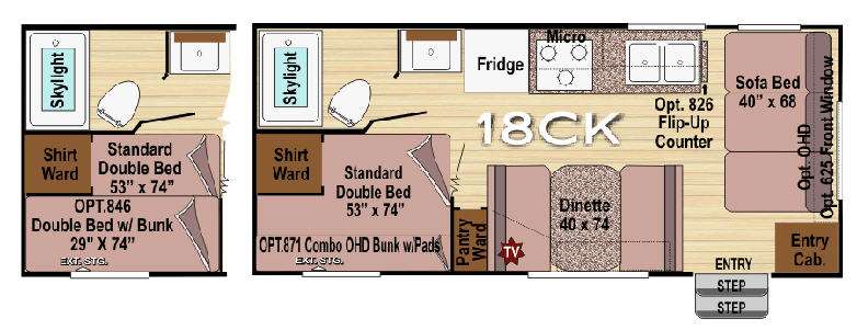 Creek Side Travel Trailer by Outdoors RV w/Rear Corner Bath w/Toilet, Skylight Above Tub/Shower, Separate Sink, Rear Corner Double Bed w/Shirt Wardrobe, Opt. Bunk Above or Combo Overhead Bunk w/Pads, Pantry/Wardrobe, Booth Dinette w/Overhead Cabinet & Opt. Opt. TV, Refrig., 3 Burner Range, Micro., Dbl. Kitchen Sink, Front Sofa Bed w/Opt. Front Window, Entry Cabinet, Opt. Flip-Up Counter and Much More!