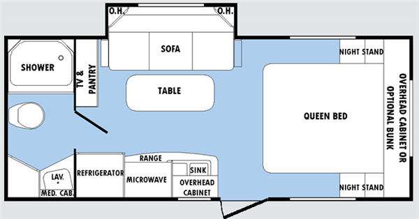 SunnyBrook Harmony Travel Trailer w/Rear Full Bath Including Shower, Toilet, Sink w/Med. Cabinet, Linen Cabinet, TV & Pantry, Refrigerator, Sofa w/Overhead Corner Storage Cabinets & Table, Range w/Microwave Above, Sink & Overhead Cabinets, Front Queen Bed w/Nightstands, Overhead Cabinet Above Bed or Optional Bunk Instead, 14' Awning and Much More!