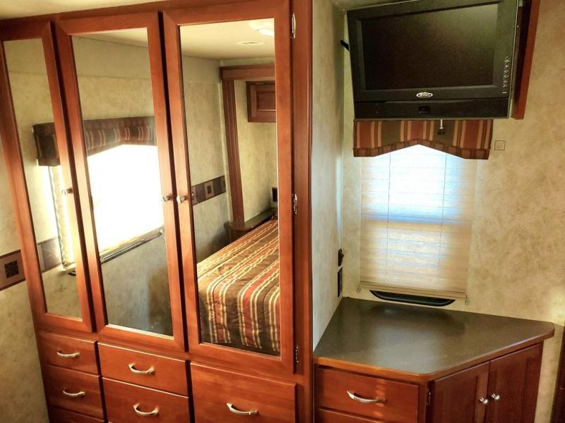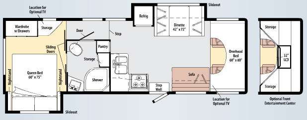 Double Slide Class C Coach w/Rear Queen Bed Slideout w/Nightstands, Wardrobe w/Drawers & Storage Cabinet, Opt. TV, Side Aisle Bath w/Double Entrance, Corner Shower, Sink, Toilet, Pantry, Storage Cabinet, Double Kitchen Sink, 3 Burner Range, Sofa, Refrigerator & Booth Dinette Slideout w/Overhead Storage, Queen Cabover Bed w/Opt. TV or Opt. Front Entertainment Center w/32" LCD TV w/Storage Cabinets Both Sides and Much More!