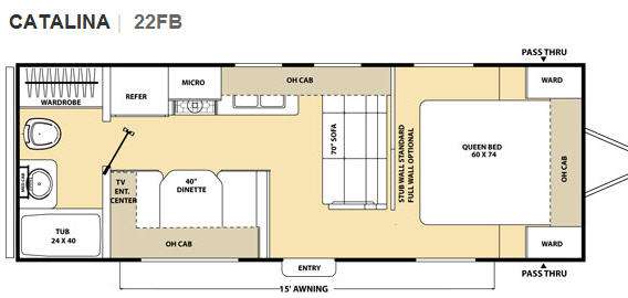 Catalina Travel Trailer by Coachmen RV w/Rear Full Bath Including Wardrobe, Tub/Shower, Toilet, Vanity w/Sink & Med. Cabinet, Booth Dinette w/TV Ent. Center w/Overhead Storage, Refrigerator, 3 Burner Cooktop, Microwave Oven, 70" Sofa, Front Queen Bed w/Wardrobes, Stub Wall Standard Between Living Area & Bedroom, 15' Awning & More! Available Options May Include: Full Wall Between Living Area & Bedroom.