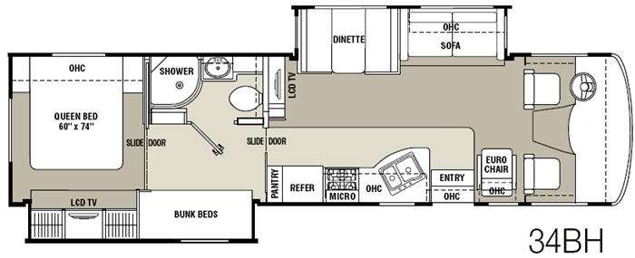 Double Slide Class A Mirada w/Bunk Beds, Rear Queen Bed w/Nightstands, Wardrobes w/LCD TV Above & Bunk Bed Slideout, Angle Shower, Sink, Toilet & Overhead Cabinet, LCD TV in Living Area, Booth Dinette & Sofa Slide, Euro Chair, Dbl. Kitchen Sink, 3 Burner Range, Refrigerator, Pantry and More!