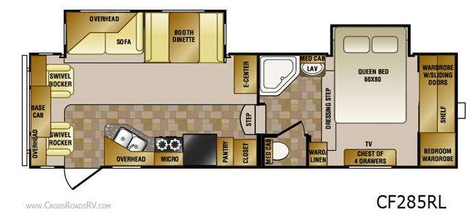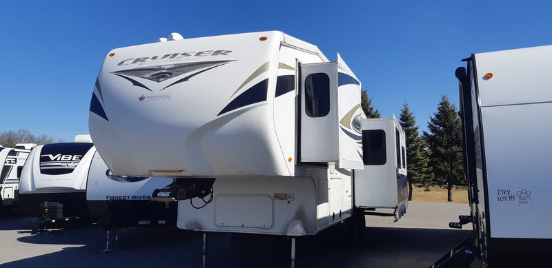 Double Slide Cruiser Patriot/Provincial Edition Fifth Wheel w/Rear Living Area, Swivel Rocker, Base Cabinet, Overhead Cabinets, Sofa & Booth Dinette Slide Out, Double Kitchen Sink, 3 Burner Range, Refrigerator, Pantry, Closet, Ent. Center, Wardrobe/Linen Cabinet, Private Toilet Area, Angle Shower, Lav. w/Med. Cabinet, Queen Bed Slide Out w/Corner Shelf, Chest of Drawers, TV, Wardrobe w/Sliding Doors w/Shelf & More.