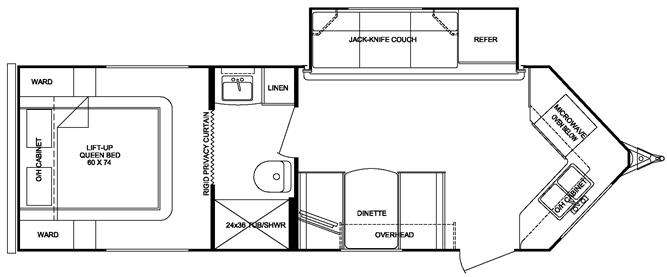Single Slide V-Nose ViewFinder Travel Trailer by Cruiser w/Rear Lift-Up Queen Bed w/Overhead Cabinets, Wardrobes Both Sides of Bed, Rigid Privacy Curtain, Tub/Shower, Toilet, Sink & Linen Cabinet, Booth Dinette w/Overhead & LCD TV, Jack-Knife Couch & Refrigerator Slide w/Dbl. Corner Overhead Shelves Above Sofa, Front Kitchen in V-Nose w/Microwave w/Oven Below, Dbl. Kitchen Sink & Overhead Cabinets & More!