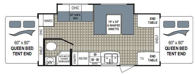 Single Slide Kodiak Expandable Travel Trailer w/Front & Rear Queen Tent End Beds w/Shelf, Bath Including Neo-Angle Shower w/Skylight, Sink w/Overhead Cab. & Toilet, Pantry, Refrigerator, 3 Burner Range, Dbl. Kitchen Sink, Wardrobe, Sofa Bed & U-Shaped Dinette Slideout, 2 Front End Tables Either Side w/TV and More!