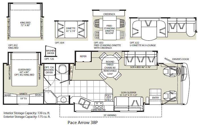 Triple Slide Pace Arrow Class A, Rear Queen Bed Slide, Nightstands, Dbl. Ward., Vanity, 19" TV, Corner Shower, Lav., Private Toilet Area, 32" TV, Refrig./Round Free-Standing Table w/Chairs/Sofa Bed w/Overhead Cab. Slide, Dbl. Kitchen Sink/2 Burner Range/Microwave/Pull-Out Shelf/Sofa Sleeper Slide, 20' Awning & More. Workhorse Chassis Available. Available Options May Include: King Bed, Washer/Dryer, Booth Dinette, Free-Standing Dinette w/Credenza, U-Dinette w/J-Lounge.