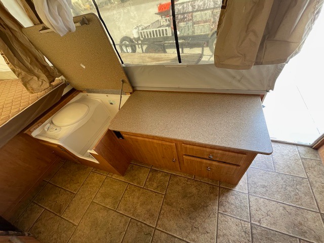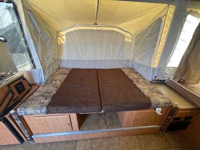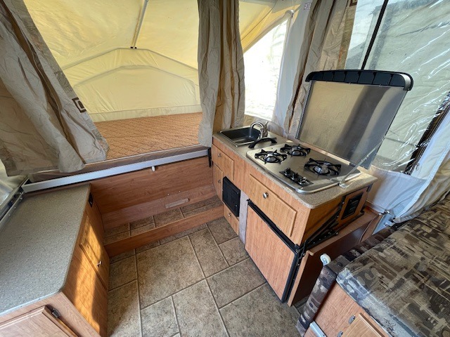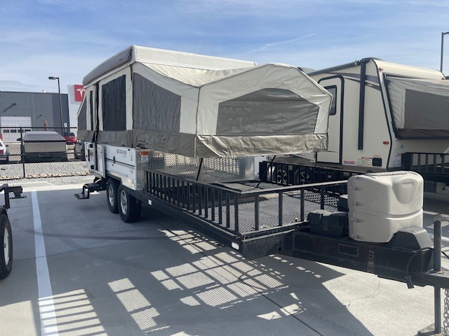 Single Slide Rockwood Freedom/LTD Folding Camper w/96 x 84 Front Deck Storage w/Expanded Metal Decking Plus Front King Size Tent End Bed, Rear Queen Tent End Bed, Ice Box, Storage Cabinet, Booth Dinette Slide w/ Water Heater, Shower w/Porta-Potty, RVQue Grill and More Storage! Available Options May Include: Heater, Refrigerator.