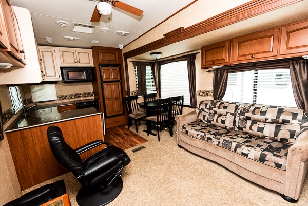 Double Slide Big Country Fifth Wheel w/Rear Kitchen Including Refrigerator, 3 Burner Range & Double Kitchen Sink, Overhead Cabinets, Sofa & Free-Standing Dinette Slideout, L-Lounge Seating, Ent. Center, Step Up to Side Aisle Bath w/Angle Shower, Lav., Double Bath Entrance, Front Queen Bed Slideout w/Storage Underbed, Walk In Closet w/Large Shoe Storage, TV Cabinet, Dresser and Much More!