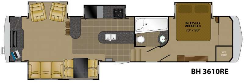 Bighorn Fifth Wheel by Heartland w/Quad Slides, Rear Ent. Center w/Overhead Storage & Desk Area, Hide-A-Bed Sofa & Dinette Slideout, 2 Rocker/Gliders in Slideout, Counter w/2 Stools, Refrig./Pantry & 3 Burner Range Slide, Dbl. Kitchen Sink, Step Up to Side Aisle Bath w/Toilet, Sink & Tub/Shower, King Bed Slide w/Underbed Storage, Washer/Dryer Prep, Walk-In Closet, Dresser & More! Available Options May Include: Fireplace, 19" LCD TV in Bedroom.