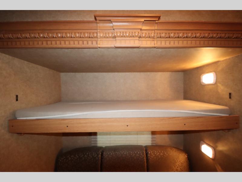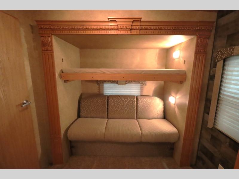 Heartland RV Elk Ridge Bunkhouse FW w/Rear Double Slideout Sofa's w/Bunks Above, Ent. Center, 1/2 Bath w/Exterior Entry, Refrig., 3 Burner Range, Dbl. Kitchen Sink, Free Standing Dinette w/Chairs & Air Mattress Hide-A-Bed, Ent. Center, Step Up to Side Aisle Bath w/Neo-Angle Shower, Toilet, Lav., Queen Bed Slide, Wardrobe, Mirrored Sliding Doors, Dresser w/Drawers and More! Available Options May Include: Camp Kitchen Option Below Upper Bunk.