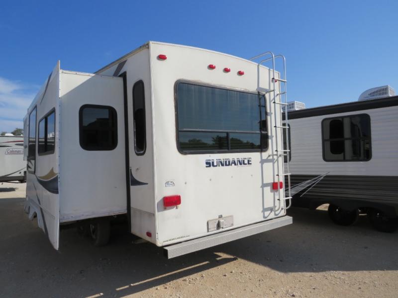 Unit is sold as is.Double Slide Sundance Fifth Wheel w/Rear Living, 2 Rockers w/Overhead Cabinets, Air Mattress Hide-A-Bed & Booth Dinette Slideout w/Overhead Storage Above Sofa, Dbl. Kitchen Sink, 3 Burner Range, Refrigerator, Pantry, LCD TV, Step Up to Side Aisle Bath w/Angle Shower, Toilet & Sink, Hall Cabinet, Front Queen Bed Slide, Full Wall Wardrobe w/Sliding Doors, Dresser & More!