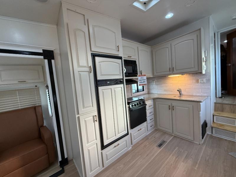 Fully Equipped Kitchen with solid countertops, refrigerator, oven, microwave, pantry, and ample storage.