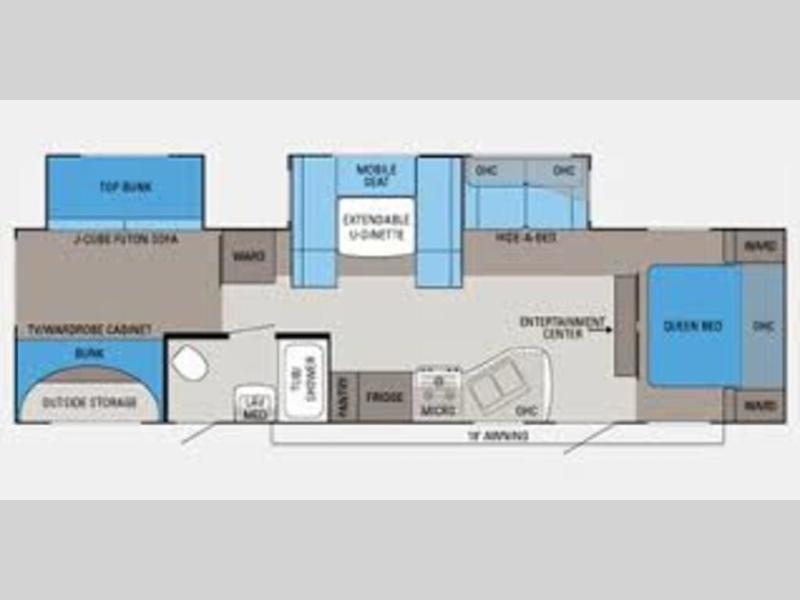 Double Slide Eagle TT w/Rear J-Cube Futon Sofa w/Upper Bunk Slideout, TV/Ward. Cabinet, Loft Bed, Ward., Toilet, Lav. w/Med. Cab., Tub/Shower, Wardrobe, U-Dinette/Hide-A-Bed Slideout, Pantry, Refrig., 3 Burner Range w/Micro., Dbl. Kitchen Sink, Enter. Cnt., Front Queen Bed, Dbl. Ward., Overhead Cabinets Throughout, 18' Awning & More. Available Options May Include: Trundle Bed w/Upper Bunk.