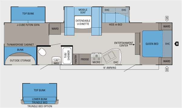 Double Slide Eagle TT w/Rear J-Cube Futon Sofa w/Upper Bunk Slideout, TV/Ward. Cabinet, Loft Bed, Ward., Toilet, Lav. w/Med. Cab., Tub/Shower, Wardrobe, U-Dinette/Hide-A-Bed Slideout, Pantry, Refrig., 3 Burner Range w/Micro., Dbl. Kitchen Sink, Enter. Cnt., Front Queen Bed, Dbl. Ward., Overhead Cabinets Throughout, 18' Awning & More. Available Options May Include: Trundle Bed w/Upper Bunk.
