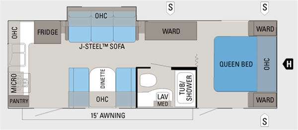 Single Slide Jay Flight TT, Rear Kitchen w/Refrigerator, 3 Burner Range, Double Kitchen Sink, Overhead Cabinet, Pantry, Microwave, Slideout J-Steel Sofa/Overhead Cabinet, Booth Dinette, Wardrobe, Bathroom, Toilet, Lav., Med. Cab., Tub/Shower, Front Bedroom, Queen Bed, Overhead Cabinet, Shirt Ward, Pass Thru Storage, 15' Awning and More.