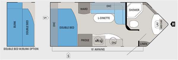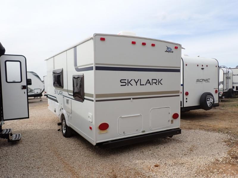 Skylark Travel Trailer by Jayco, Rear Double Bed, Wardrobe, L-Dinette w/Table, V-Nose Bath w/Shower, Toilet, Lav., Med. Cab., Linen, Single Galley Sink, Microwave, 2-Burner Cooktop, Refrigerator, Overhead Cabinets Throughout, 15' Awning & Much More. Available Options May Include: Double Bunk w/Bunk Above.