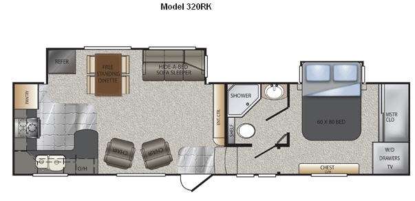Keystone Avalanche FW w/Rear Kitchen Including: Pantry, 3 Burner Range, Dbl. Kitchen Sink, Overhead Cabinet Space, Refrigerator/Free Standing Dinette & Hide-A-Bed Sofa Sleeper Slideout, 2 Lounge Chairs, Ent. Center, Step Up to Side Aisle Bath Including Angle Shower, Toilet & Sink, Shelf Above Toilet & Dbl. Bath Entry, Front Queen Bed Slide, Master Closet w/Sliding Doors, Wash/Dryer Prep/Drawers, Chest and Much More! Available Options May Include: TV in Bedroom