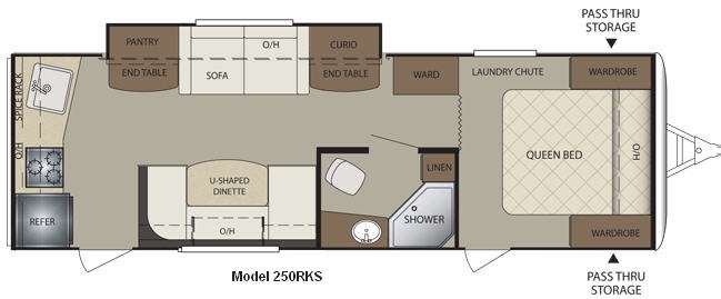 Bullet Travel Trailer by Keystone RV w/Rear Kitchen Including Refrigerator, 3 Burner Range, Overhead Cabinet, Spice Rack, Sink, U-Shaped Dinette w/Overhead, Pantry/End Table/Sofa/Curio Cabinet/End Table Slide, Wardrobe, Bath w/Angle Shower, Vanity w/Sink, Toilet & Linen Cabinet, Front Queen Bed w/Private Entry, Wardrobes Both Sides of Bed, Front Pass-Thru Storage and More!