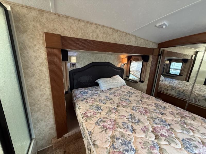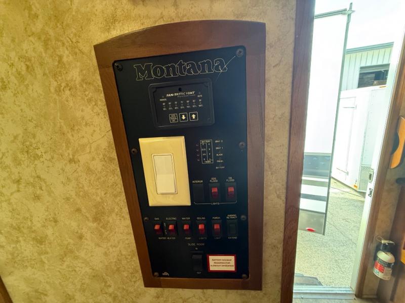 Keystone Montana FW w/Triple Slideouts, Rear Living Area w/2 Recliners & Overhead Cabinets, Sofa w/Air Mattress Hide-A-Bed & Free Standing Dinette Slideout, Desk/Ent. Center Slide w/Overhead & 32" LCD TV, L-Shaped Counter w/Dbl. Kitchen Sink & 3 Burner Range, Refrigerator, Step Up to Bed & Bath w/36" Angle Garden Tub, Private Toilet Area, Sink, 6 Drawer Chest, Washer/Dryer Prep, Wardrobe, Queen Bed Slideout w/Nightstands, 19" LCD TV, Hamper and Much More! Available Options May Include: King Bed.