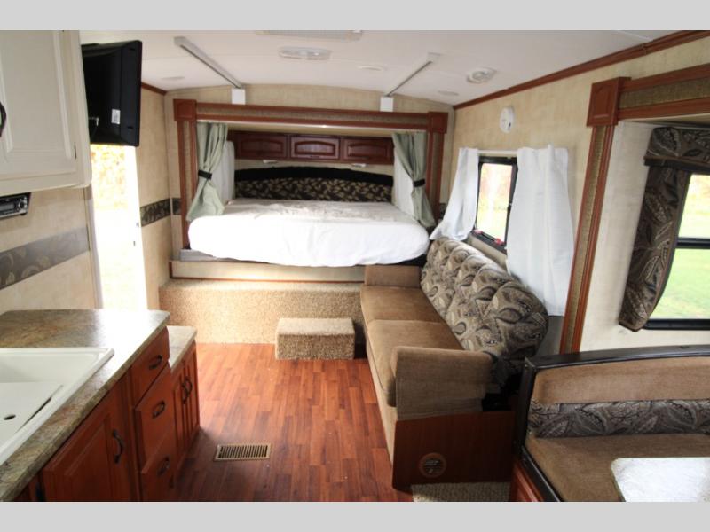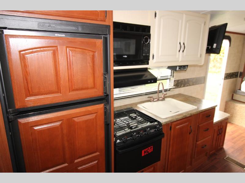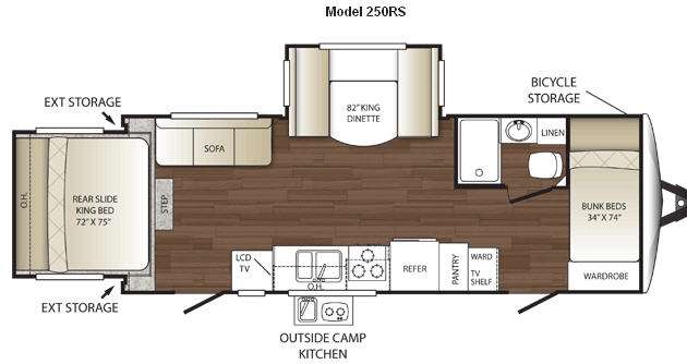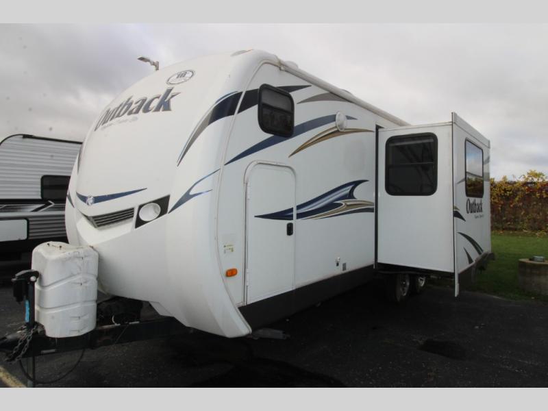Double Slide Outback Travel Trailer w/Rear Slide King Bed, Pass Thru Storage, Sofa, LCD TV, King Dinette Slideout, Dbl. Kitchen Sink, 3 Burner Range, Refrig., Pantry, Tub, Lav., Linen, Toilet, Ward./TV Shelf, Front Bunk Beds w/Ward., Bike Storage in Front, Outside Camp Kitchen and More.