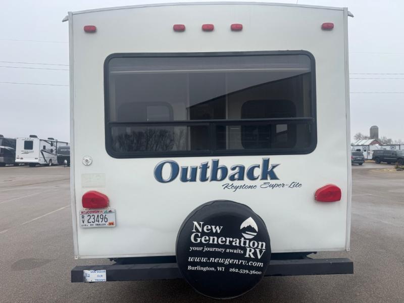 Keystone Outback Travel Trailer (Dealer Stock Only) w/Rear Living Area Including Pop-Up LCD TV w/Overhead Cabinets Both Sides, 2 Lounge Chairs Slide, Air Sofa Sleeper & King Dinette Slide, Refrigerator, Dbl. Kitchen Sink, 3 Burner Range, Pantry/Linen Cabinet, Side Aisle Bath w/Angle Shower, Toilet & Sink, Front Queen Bed w/Wardrobes, Pass-Thru Storage and More!