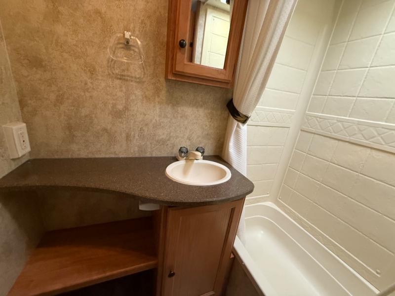 The fully equipped kitchen makes mealtime easy with a refrigerator, three-burner range, oven, and microwave, plus plenty of storage for pantry essentials. A full bathroom with shower, vanity, and toilet ensures you can enjoy the convenience of home wherever your adventures take you.