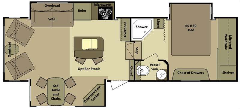 Triple Slide Roamer FW w/Rear Living Area Including 2 Lounge Chairs w/Table Between & Overhead Cabinets, Dinette w/Chairs & Ent. Center Slide, Sofa/Refrigerator & 3 Burner Range Slide, Kitchen Island w/Dbl. Sink & Entry Closet, Step Up to Bed & Bath w/Angle Shower, Linen Cabinet, Private Toilet Area w/Vessel Sink, Front Queen Bed Slide, Chest of Drawers, Mirrored Wardrobe w/Sliding Doors, Shelves and Much More! Available Options May Include: 2 Bar Stools