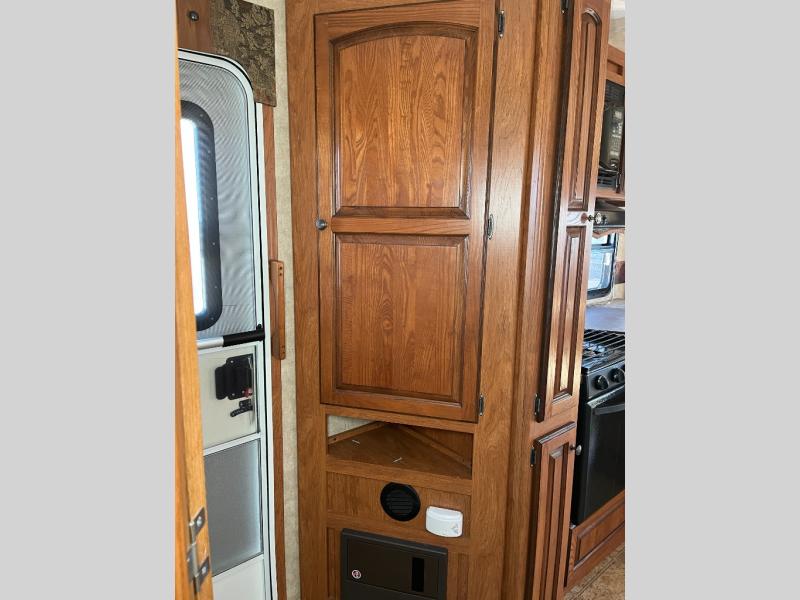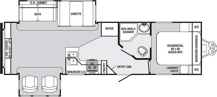 Sabre Travel Trailer by Palomino w/Rear Living Area w/Full End Wall Ent. Center w/Electric Lift, 2 Swivel Rockers Slideout, Sofa & Booth Dinette Slide, Dbl. Kitchen Sink, 3 Burner Range, Pantry, Microwave, Corner Entry Cabinet, Refrigerator, Side Aisle Bath w/Neo-Angle Shower, Toilet & Sink, Door to Front Bedroom w/Residential Queen Bed, Laundry Chute, Nightstands Both Sides of Bed & More! Available Options May Include: La-Z-Boy Recliner or Euro Style Chair w/Ottoman IPO Swivel Rockers.