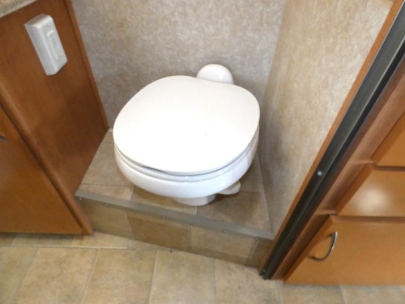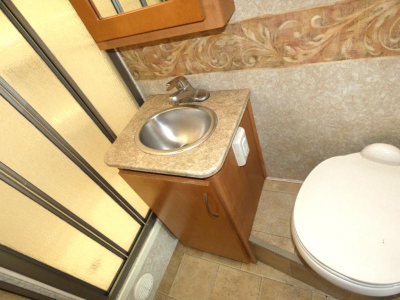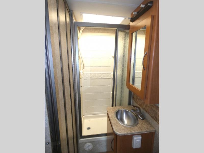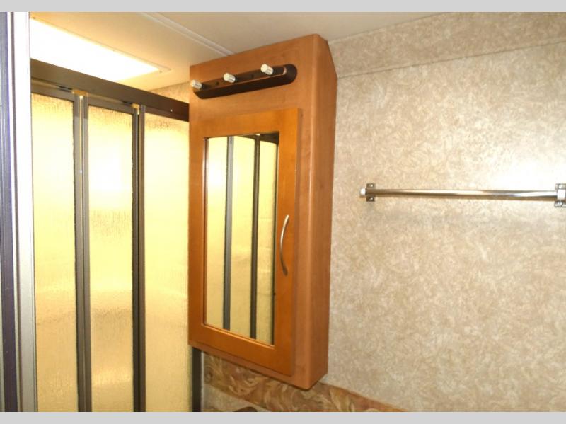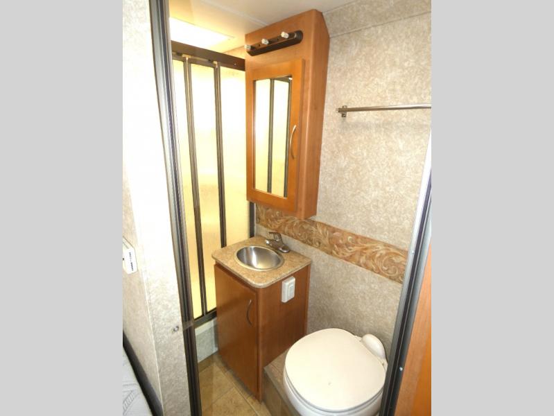 In the rear of the Siesta Sprinter 24SA you will find a corner bathroom including a shower, vanity sink, medicine cabinet, and a toilet. There is a closet just outside the bath. .