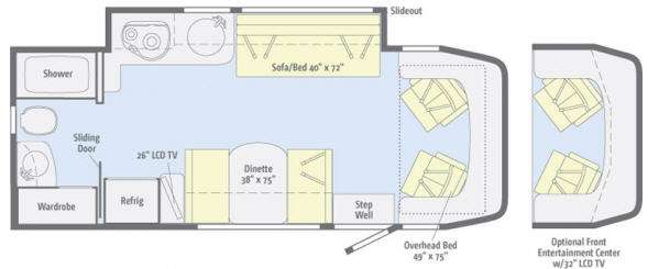 Winnebago View Class C Diesel Coach w/Rear Full Bath Including Tub/Shower, Toilet, Sink & Wardrobe, Sliding Door to Living Area w/Slideout 2 Burner Range/Round Sink & Sofa Bed, Front Overhead Bed 49"x75", Booth Dinette w/26" LCD TV Above, Refrigerator and Much More! Available Options May Include: Front Ent. Center w/32" LCD TV.