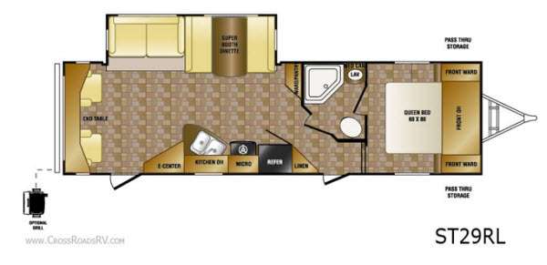 Single Slide Sunset Trail Travel Trailer (Dealer Stock Only), Rear Living Area w/2-Lounge Chairs, End Table, Sofa/Super Booth Dinette Slide, Wardrobe/Pantry, Entertainment Center, Double Kitchen Sink, 3-Burner Range, Microwave, Refrigerator, Linen, Toilet, Shower, Lav., Med. Cab., Queen Bed, Dbl. Front Wardrobes, Overhead Cabinets Throughout, Front Pass Thru Storage & Much More. Available Options May Include: Grill.
