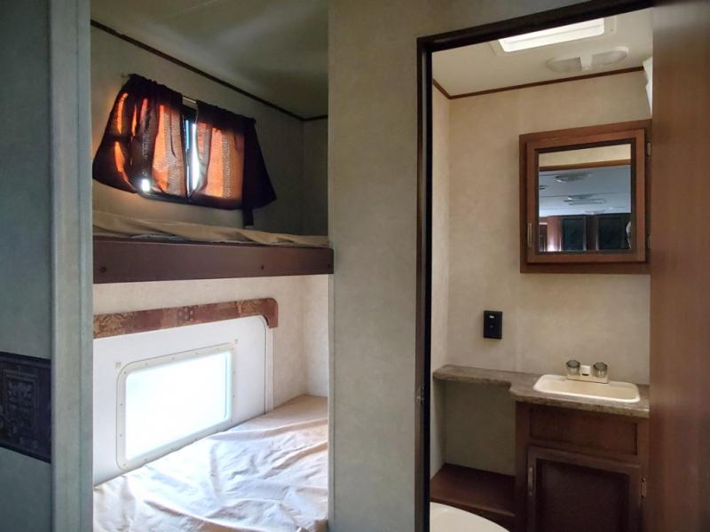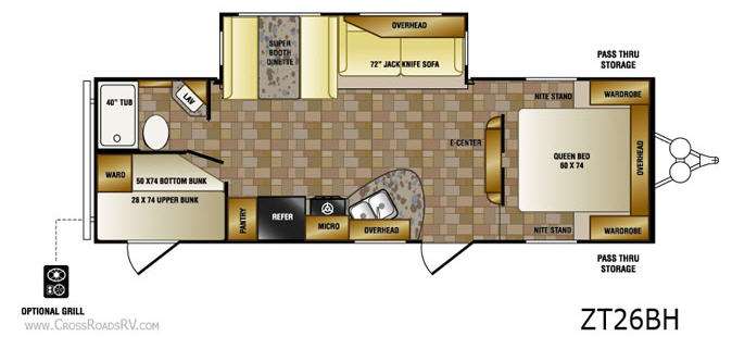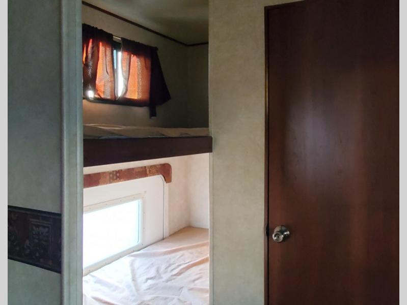 Zinger Single Slide Bunkhouse Travel Trailer w/Rear Double Bed w/Bunk Above, Rear Corner Bath w/Tub, Lav., & Toilet, Wardrobe, Pantry, Refrigerator, 3 Burner Range w/Microwave, Double Kitchen Sink, Overhead Cabinets, Sofa/Booth Dinette Slideout, Ent. Center, Front Queen Bed, Dbl. Wardrobes w/Nightstands Below, Overhead Cabinets Throughout and More. Available Options May Include: Grill.